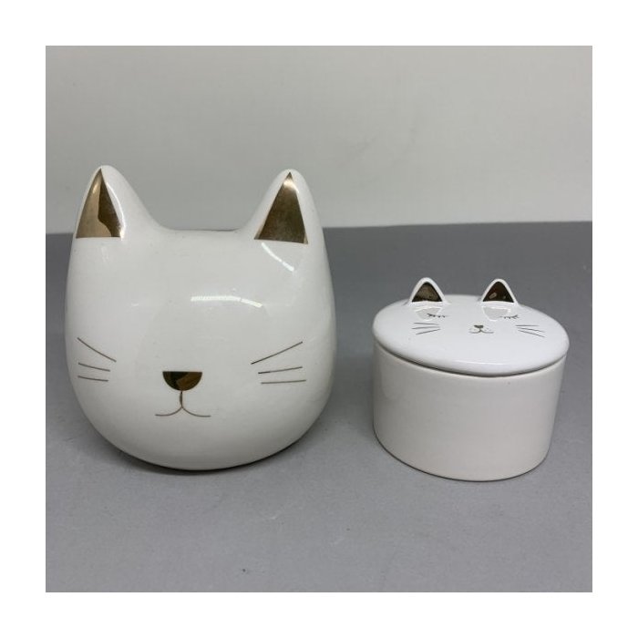 Kit Cofre e potiche gatinho branco e dourado de cerâmica.