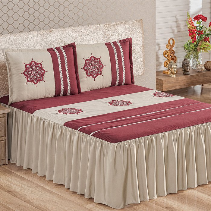 Kit Colcha Casal Mandala Tecido Microfibra Bordada 5 Peças - Vinho