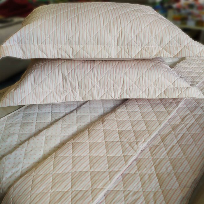 | Informações Complementares (Novo) | Colcha matelada com os dois lados estampados, um listrado e outro poa. Uma releitura moderna da estampa tradicional listrada. O tecido utilizado é o percal 200 fios de toque suave, os porta travesseiros possuem abas. |