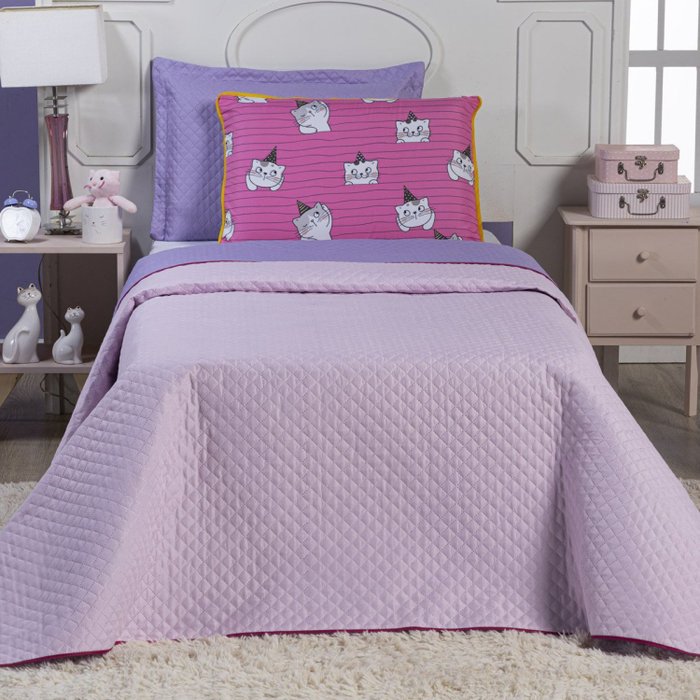 Kit Colcha Infantil Juvenil com Fronha Estampada Gatinhos Solteiro 3 Peças Dupla Face Rosa/Lilás