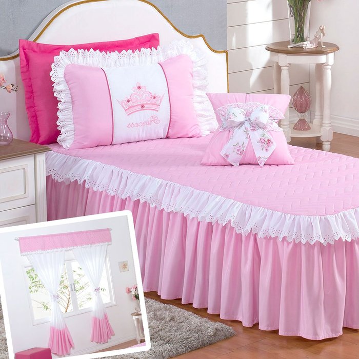 Kit Colcha Infantil Solteiro Menina Coroa com Almofada Decorativa + Cortina para Quarto Infantil
