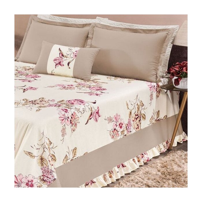 Kit Colcha Queen Size Riviera 180 Fios 7 Peças Floral Cáqui