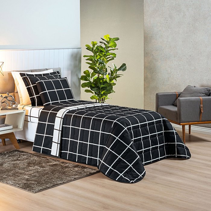 Kit Colcha Solteiro 5 Peças Cobre Leito Lençol e Fronhas Jogo Cama Elastico 200 Fios Preto