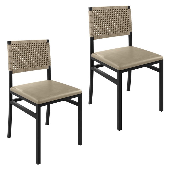 Transforme sua sala de jantar ou cozinha com este kit de 2 cadeiras modernas. Com estrutura resistente em aço pintado, assento estofado em courino preto macio e encosto em trama sintética estilo rattan, elas oferecem conforto, durabilidade e um design sofisticado que combina facilmente com qualquer ambiente. Compactas, firmes e fáceis de limpar, são ideais tanto para o uso diário quanto para receber visitas.