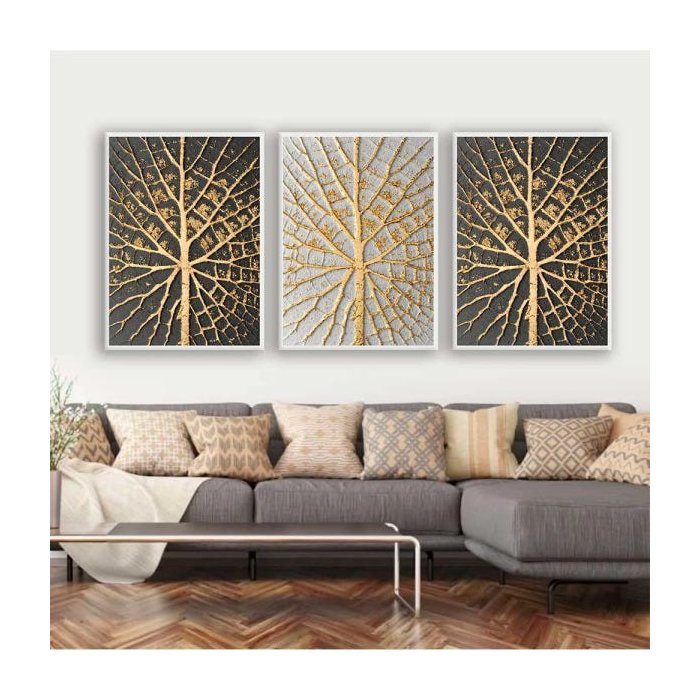 Kit com 03 Quadros Arte 3D Folhas de Ouro - Clean Box 2x3-Branca