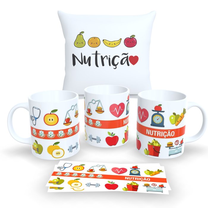 Kit com 1 Caneca de Porcelana e 1 Almofada Branca 30x30cm Personalizadas Profissões "nutrição" branco