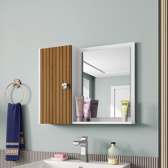 Kit com 2 Espelheiras para Banheiro 1 Porta 2 Prateleiras Gênova Branco/Ripado