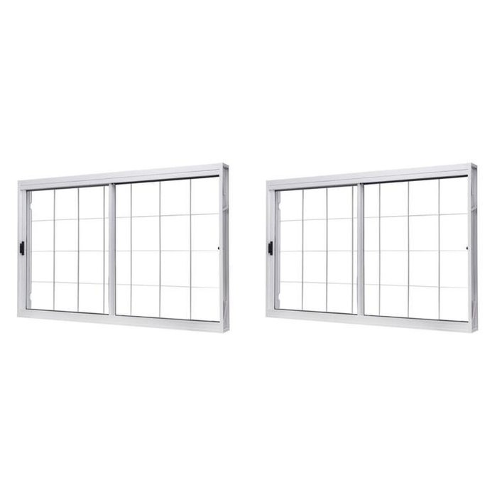 Kit com 2 Janelas de Aço de Correr Central 100x150cm 2 Folhas com Grade Quadriculada e Vidro Liso Branco