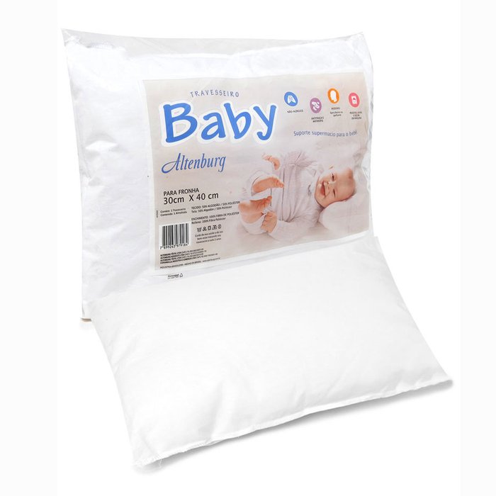 O Travesseiro Altenburg para Bebê com fronha branca, tem formato padrão baby de 30cm x 40cm. Confeccionado com tecido 50% algodão e 50% poliéster e enchimento 100% poliéster é o ideal para o bercinho do seu pequeno.