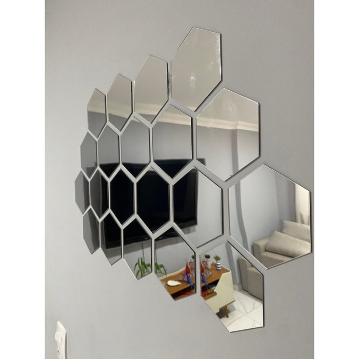 Transforme seus ambientes com estilo e praticidade usando o Kit de Espelhos Decorativos Hexagonais. Produzidos em acrílico de alta qualidade, esses espelhos são leves, resistentes e ideais para qualquer espaço, incluindo banheiros, pois podem ser molhados sem comprometer sua durabilidade ou brilho.