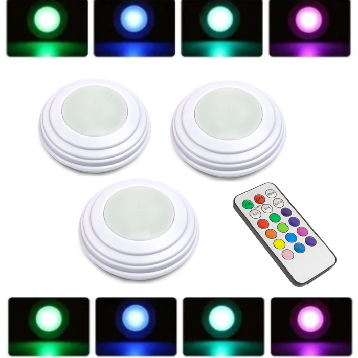 Kit 3 Luminárias Lâmpadas Led Spot Sem Fio Com Controle Remoto, ideal para serem utilizadas em guarda-roupas, armários, gavetas, corredores, varandas, escritórios, quartos, estantes, cabeceiras de camas, toaletes, espelhos, nichos, closets, escadas, balcões, escrivaninhas e em vários locais que necessitam de iluminação colorida sem a necessidade de perfurações, parafusos e cabos.
