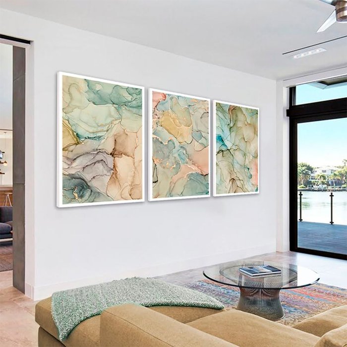Kit com 3 Quadros Decorativos 70x50 Cm Abstrato Mancha com Moldura Caixa Branca de 3cm Profundidade