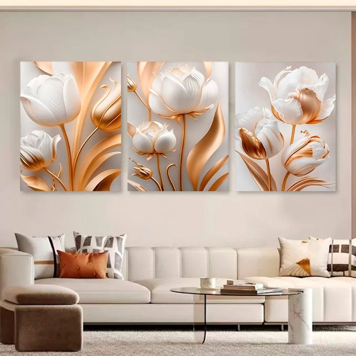 Kit com 3 Quadros Decorativos 70x50 Cm Floral Romantico, Tela Canvas, na Posição Vertical