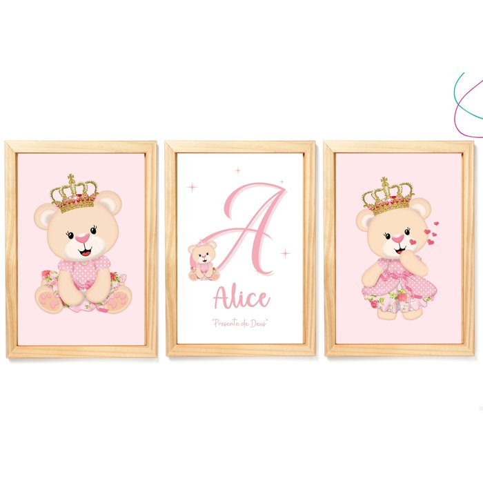 Kit com 3 Quadros Decorativos do Tema Ursinha Princesa:Pinus