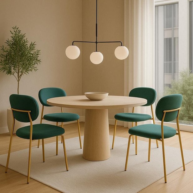 Seu formato arredondado, com encosto curvo e assento estofado, garante ergonomia e versatilidade. O conjunto está disponível com diversas opções de revestimento — ideal para salas de jantar, recepções, escritórios e projetos personalizados.