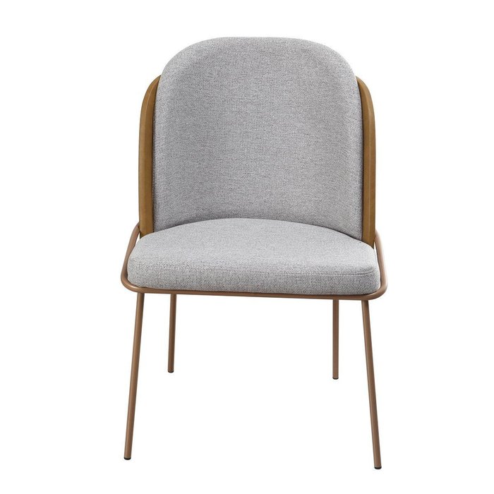 As cadeiras possuem estrutura em aço carbono com pintura epóxi na cor champanhe, que proporciona resistência e um acabamento refinado. O assento e encosto apresentam um revestimento diferenciado que mescla linho Lincoln cinza e courino Durango kaki, criando um visual moderno, texturizado e versátil para diferentes estilos de decoração.