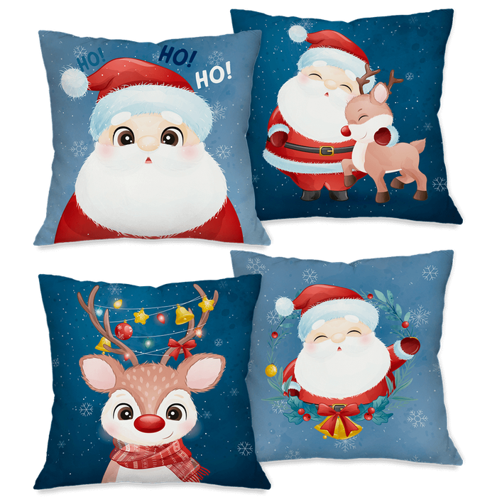 Kit com 4 Capas para Almofadas Natalinas Rena e Noel Cute Azul