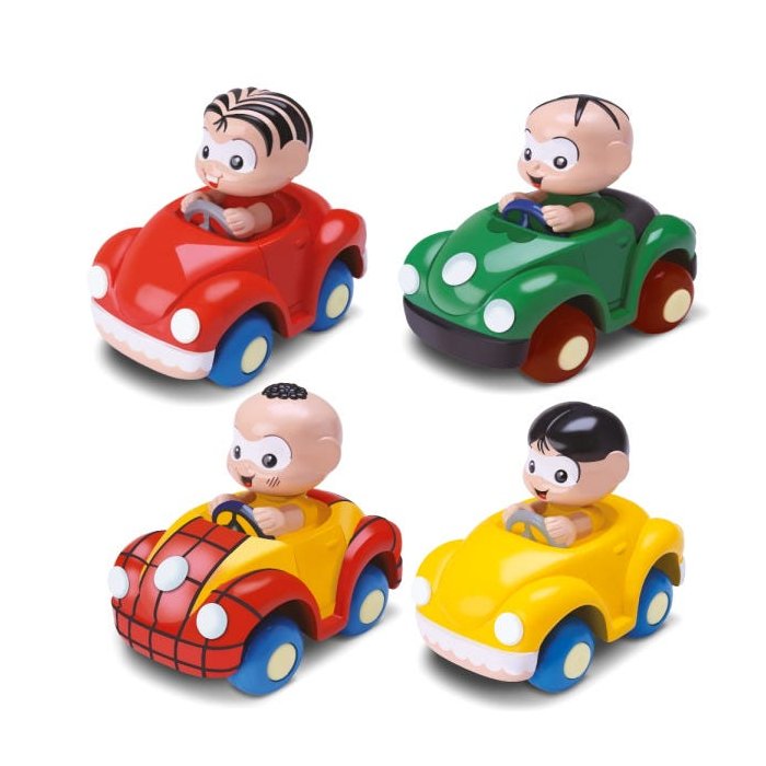 Este kit contém: 01 carrinho mordedor modelo Monica, 01 carrinho mordedor modelo Cebolinha, 01 carrinho mordedor modelo Cascão, 01 carrinho mordedor Magali