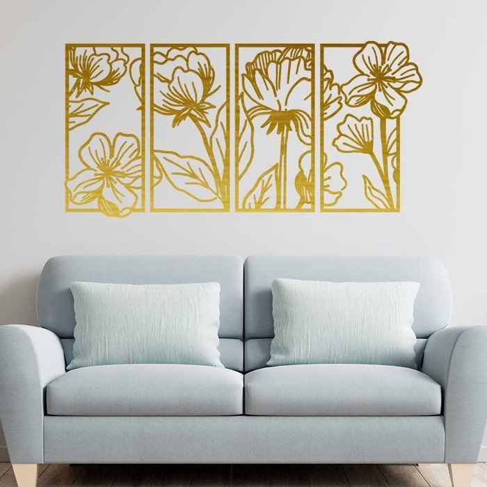 Kit Com 4 Quadros Em Mdf Vazado Modelo Florescendo Com Rosas Desabrochando - 1,30 X 0,67 Metros Cor Dourado Kit com 4 quadros Florescendo. Harmonize seu ambiente com lindos quadros em MDF da Up Art Personalizados. Pensando em você, e na decoração da sua casa, a Up conta com uma grande variedade de produtos decorativos exclusivos, que agregam beleza e simplicidade ao seu lar. Os quadros com referência floral são clássicos, e de uma forma efetiva realçam a beleza de um interior com muita praticidade. Características:Material:MDF.Espessura:3mm.Tamanho:3 quadros medindo 30x60cm e 1 quadro medindo 40x67cm. Instalação: É bem simples, contendo fita dupla face no verso do quadro, sem necessidade de fazer buracos na parede da sua casa.Cuidados e Precauções com seu Quadro:Não instalar em ambientes úmidos, externos, paredes texturizadas e não molhar.Limpeza do seu Quadro: Apenas um pano seco para tirar o pó. Principais Dúvidas:Essa fita dupla face é mesmo resistente?