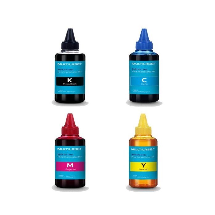 Kit c/ 4 Refil De Tinta p/ Recarga Cartucho Hp 100ml Volume 100ml cada frasco. Acompanha as 4 cores: Preto/Ciano/Magenta/Amarelo