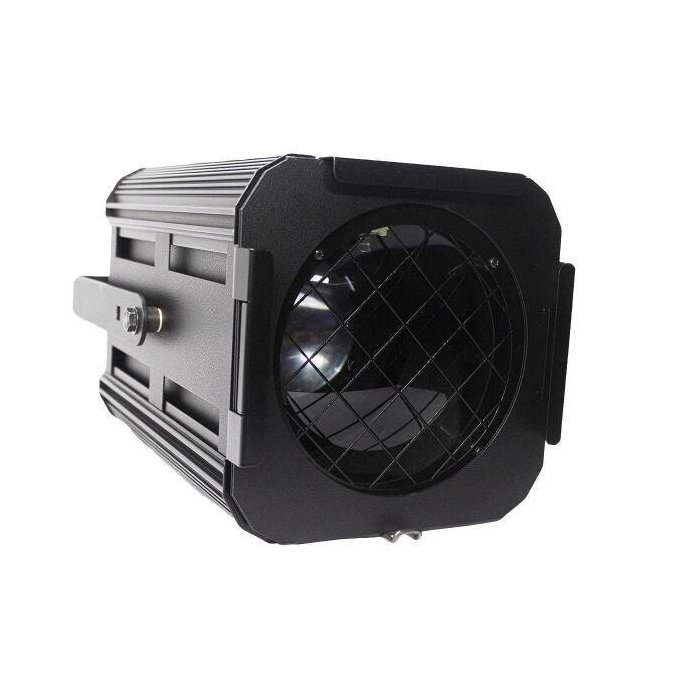 Projetor plano-convexo para lâmpadas halógenas de 650W ou 1KW (base Gx 9,5). Sua característica é a projeção de bordas focadas.