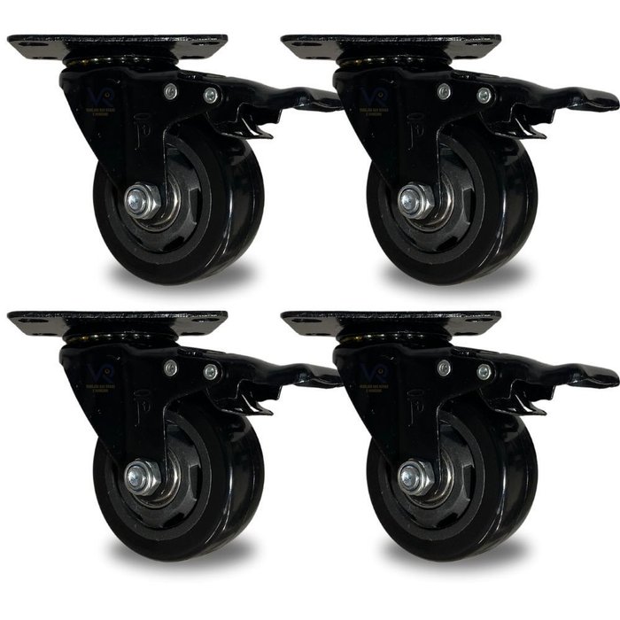 Kit com 4 Rodinha Giratório 3" Black Pvc Preto com Rolamento 75mm com Trava 10,6cm Carga 400kg Placa Preto