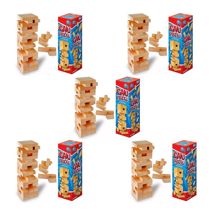 Kit Com 5 Jogo Caiu Perdeu Torre De Madeira Jenga 54 Peças Pais & Filhos