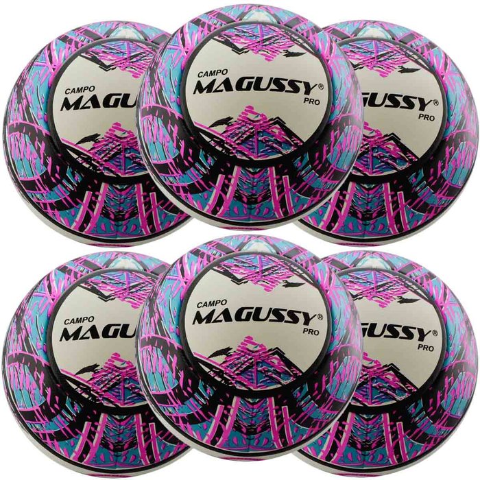 KIT C/ 6 UNIDADES Profissional! A bola de futebol campo Magussy PRO FUSION SYSTEM tem características exatamente iguais às principais bolas usadas nas grandes ligas profissionais ao redor do mundo. Produzida em PU SUPER soldado a partir de Termofusão, possui um composto microcelular NEOGEO combinado com fios de poliéster de alta tenacidade, multiaxiais vulcanizados. Faz com que a bola ganhe mais aderência ao contato, mais maciez, mais controle e maior durabilidade, atendendo todas as especificações profissionais. Seus 8 gomos FUSION SYSTEM faz com sua estrutura seja totalmente impermeável, mesmo em contato com chuva pesada a bola manterá 0% de absorção de água, preservando o seu tamanho e peso que são oficiais. Circunferência: 68-69 cm. Peso: 425 - 445 gramas. Câmara airbility. Miolo substituível e lubrificado. 8 gomos. 0% absorção de água. Origem: nacional. Garantia: contra defeito de fabricação.