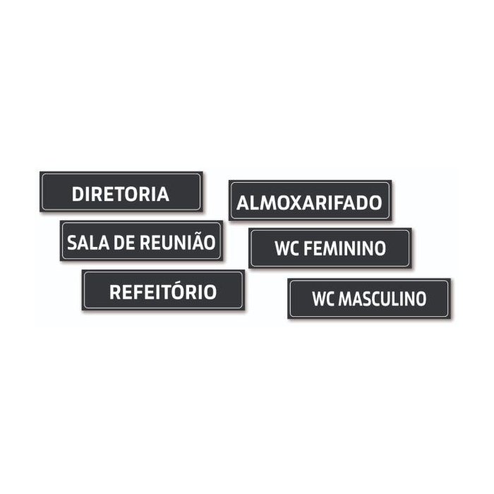 KIT COM 06 PLACAS DE SINALIZAÇÃO INTERNA PARA EMPRESAS, ESCRITÓRIOS, ACADEMIAS, ESCOLAS, ETCPLACAS EM PS 2mm adesivadoMedidas 30cm x 12cm (de cada placa)Fácil Aplicação utilizando fita dupla face (as placas são enviadas com a fita no verso)