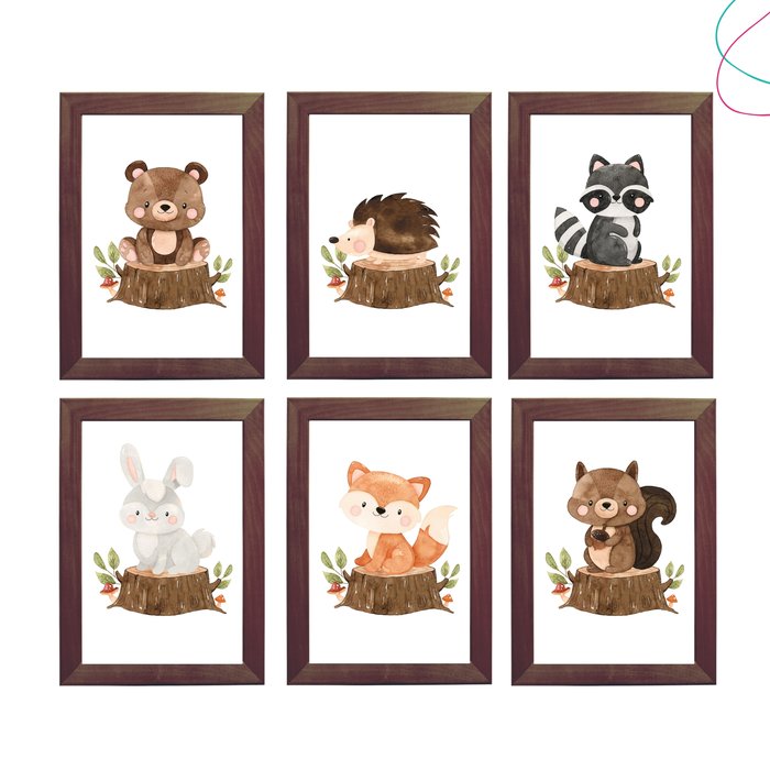Kit com 6 Quadros Decorativos Animais do Bosque Aquarela:Tabaco