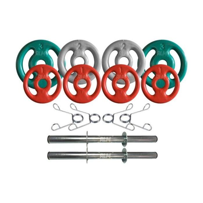 Kit com Barras de Halteres e Anilhas Emborrachadas - 14 Kg <strong>Acompanha o Kit:</strong> 02(Duas) barras de tubo oca 40 cm; 04(Quatro) presilhas¿; 04(Quatro) anilhas emborrachadas de 1Kg; 02(Duas) anilhas emborrachadas de 2Kg; 02(Duas) anilhas emborrachadas de 3Kg; Exercitar-se é um excelente remédio para o corpo e para a alma. As academias estão cada dia mais lotadas; são homens e mulheres em busca do corpo perfeito ou simplesmente em busca de saúde e bem estar. Mas é preciso que elas estejam equipadas e bem preparadas para receberem os seus alunos e o combo de anilhas emborrachadas é uma ótima opção para equipar a sua academia com produtos de qualidade. O combo também é ideal para você que gosta de malhar em casa com todo o conforto e comodidade, pois vem com um conjunto completo de pesos marcados e identificados para ajudar na correta execução de seus exercícios. <strong>Especificações e Características:</strong> - As anilhas são confeccionadas em ferro fundido com revestimento em PVC; - O diâmetro do furo é de aproximadamente 31mm; - As anilhas são identificadas por marcação com números de seus respectivos pesos; - Produto com excelente acabamento; - Aferição do peso de até 5% para mais ou para menos; - Barras com tratamento zincado - Capacidade de pesos da barra de 40cm: 40Kg total; - Peso de cada barra de 40cm: Aprox. 400g <strong>Importante: Para iniciantes aconselhamos o acompanhamento de um profissional, evite utilizar as barras na vertical pois as presilhas podem se soltar e ocasionar a queda das anilhas.</strong>