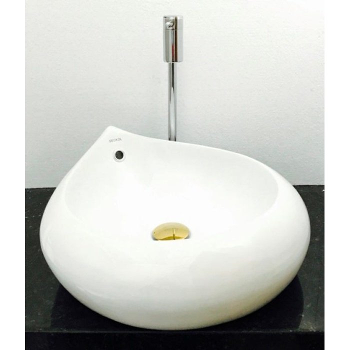 Dimensões: 46,5 x 19,5cm material: cerâmica. kit 3 peças com cuba de louça de sobrepor gota, válvula click dourada para lavatórios e torneira cromada 90