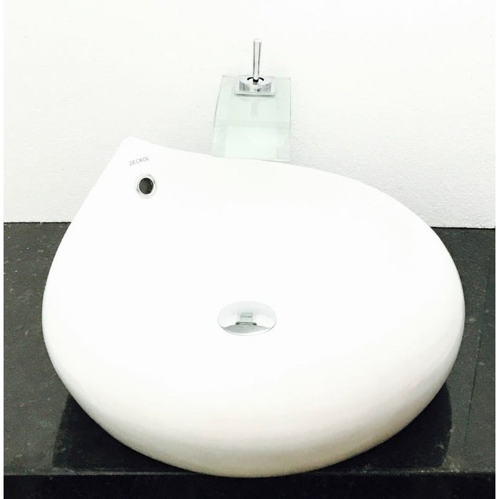 Dimensões: 46,5 x 19,5cm material: cerâmica. kit 4 peças com cuba de louça de sobrepor gota, válvula click cromada para lavatórios, torneira bico de pato de vidro temperado e sifão cromado