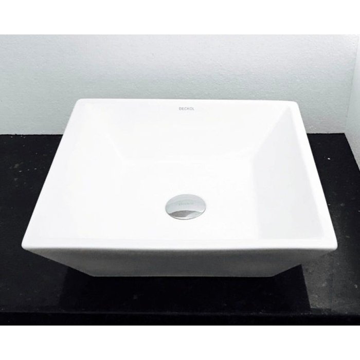 Dimensões: 41 x 41 x 12cm material: louça. kit 2 peças com cuba de louça de sobrepor quadrada e válvula click cromada para lavatórios