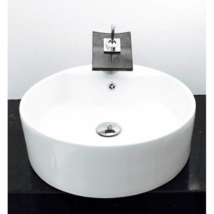 Dimensões: 46,5 x 17cm material: cerâmica. kit 3 peças com cuba de louça de redonda de sobrepor com apoio para torneira, válvula click cromada para lavatórios e torneira cascata quadrada fumê de vidro temperado