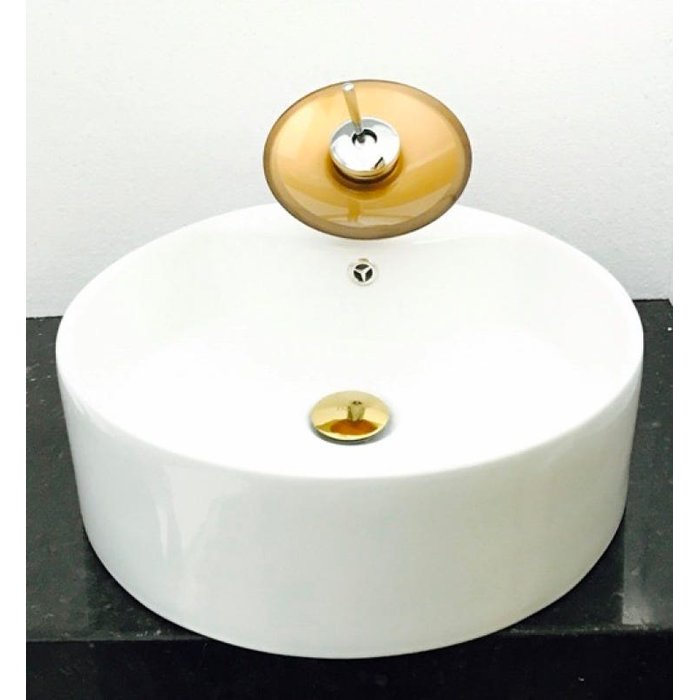 Kit com cuba de louça redonda apoio,válv dourad,torneira