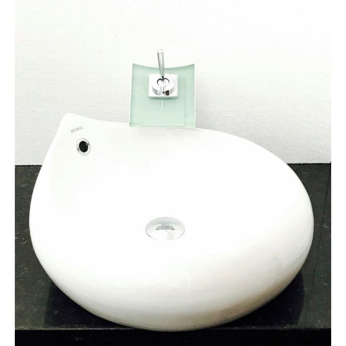 Dimensões: 46,5 x 19,5cm material: cerâmica. kit 3 peças com cuba de louça de sobrepor gota, válvula click cromada para lavatórios e torneira cascata quadrada branca de vidro temperado