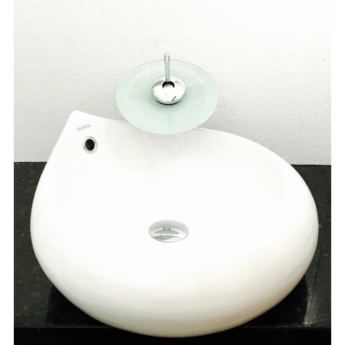 Dimensões: 46,5 x 46,5 x 19,5cm material: cerâmica. kit 3 peças com cuba de louça gota de sobrepor, válvula click cromada para lavatórios e torneira cascata redonda de vidro temperado branco