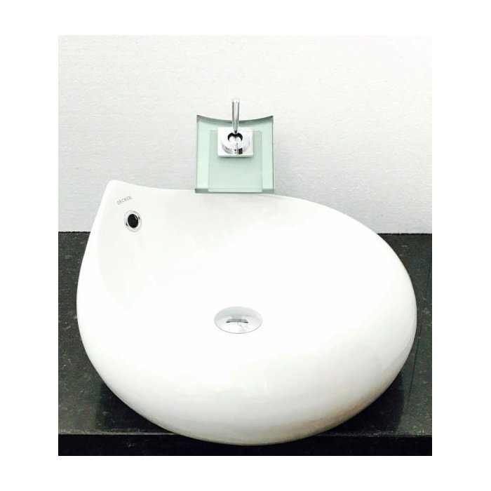 Dimensões: 46,5 x 19,5cm material: cerâmica. kit 3 peças com cuba de louça de sobrepor gota, válvula click cromada para lavatórios e torneira cascata quadrada prateada de vidro temperado