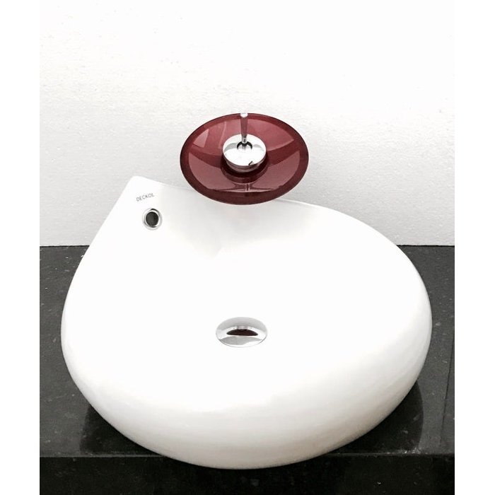 Dimensões: 46,5 x 46,5 x 19,5cm material: cerâmica. kit 3 peças com cuba de louça gota de sobrepor, válvula click cromada para lavatórios e torneira cascata redonda de vidro temperado vermelha