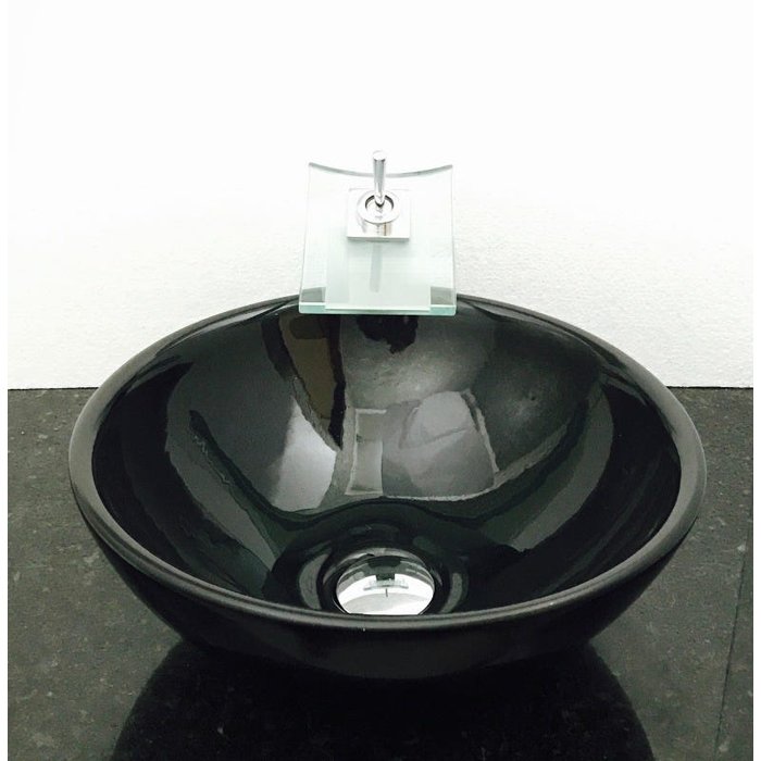 Dimensões: 41 x 16cm material: cerâmica. kit 3 peças com cuba de louça preta de sobrepor redonda, válvula click cromada para lavatórios e torneira cascata quadrada de vidro temperado incolor