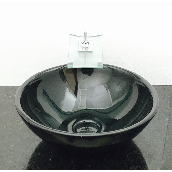 Dimensões: 41 x 16cm material: cerâmica. kit 4 peças com cuba de louça preta de sobrepor redonda, válvula click cromada para lavatórios, torneira cascata quadrada de vidro temperado e sifão cromado