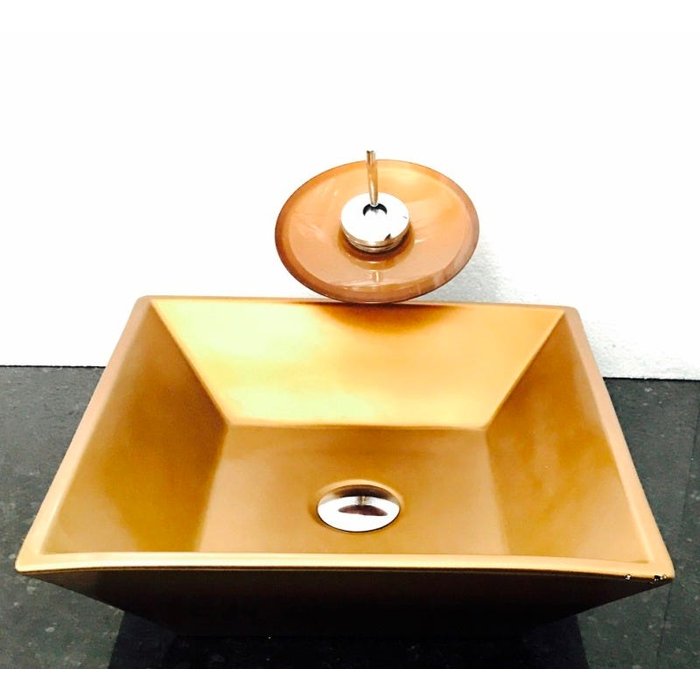 Kit com cuba louça quadrada dourada cobre,válvula e torneira