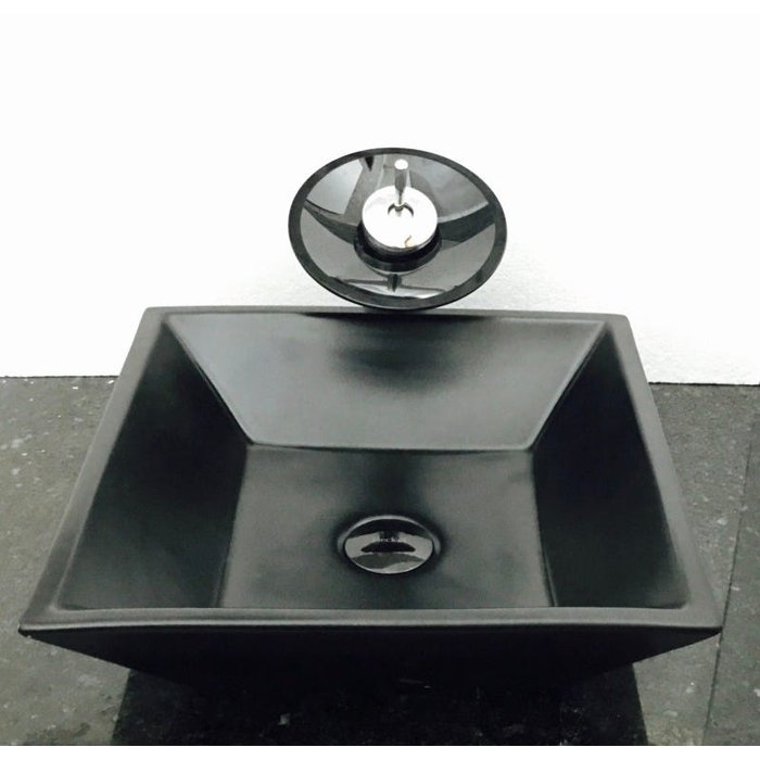 Dimensões: 41 x 41 x 12cm material: cerâmica. kit 3 peças com cuba de louça quadrada preta de sobrepor, válvula click preta para lavatórios e torneira cascata redonda de vidro temperado preta