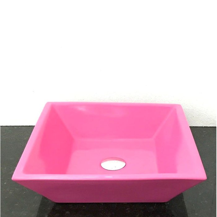 Dimensões: 41 x 41 x 12cm material: cerâmica. kit 2 peças com cuba de louça de sobrepor quadrada na cor rosa e válvula click cromada para lavatórios