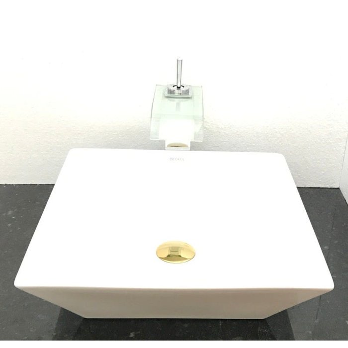 Dimensões: 41 x 41 x 12cm material: cerâmica. kit 4 peças com cuba de louça de sobrepor quadrada, válvula click dourada para lavatórios, torneira bico de pato de vidro temperado e sifão cromado