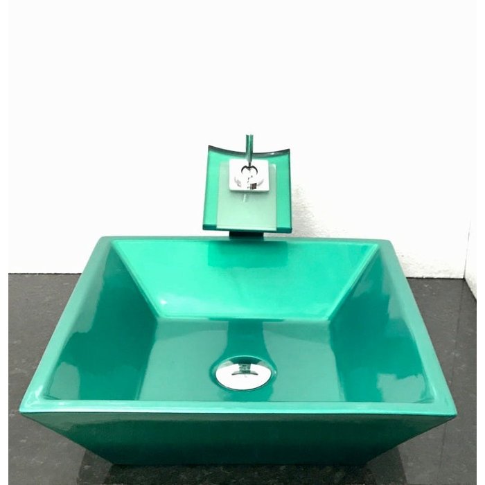 Kit com cuba louça quadrada verde,válvula,torneira,sifão