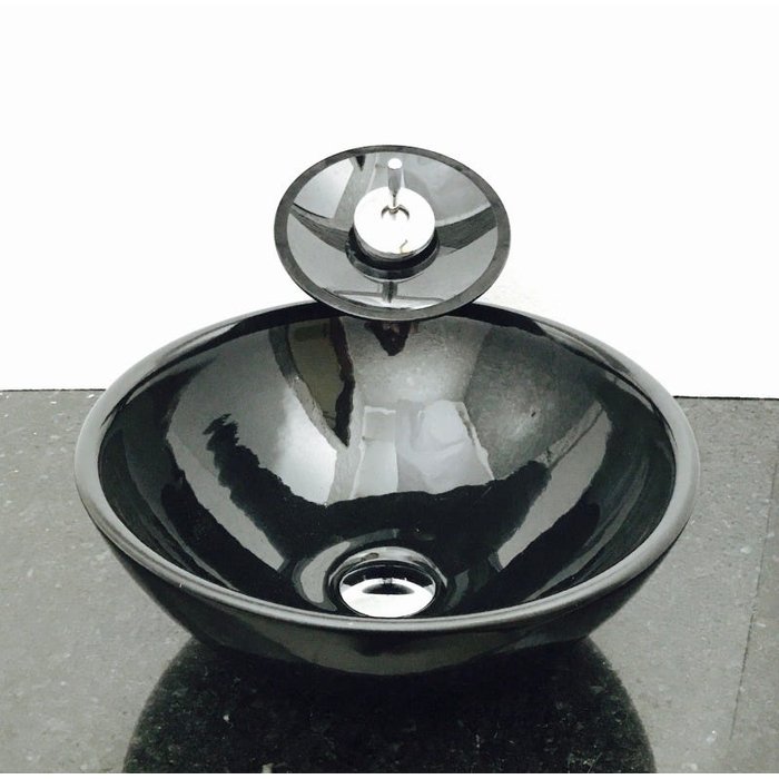 Dimensões: 41 x 41 x 16cm material: cerâmica. kit 3 peças com cuba de louça redonda preta de sobrepor, válvula click cromada para lavatórios e torneira cascata redonda de vidro temperado preta