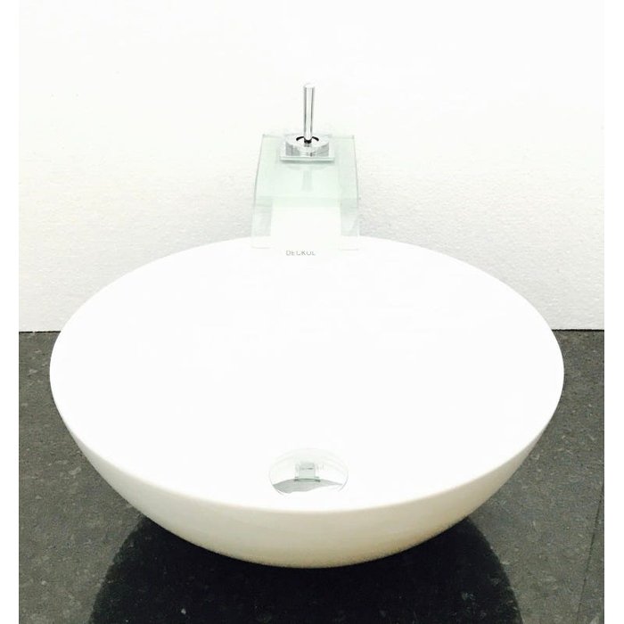 Dimensões: 41 x 16cm material: cerâmica. kit 3 peças com cuba de louça de sobrepor redonda, válvula click cromada para lavatórios e torneira bico de pato de vidro temperado