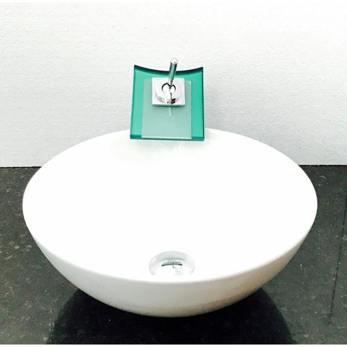 Dimensões: 41 x 16cm material: cerâmica. kit 3 peças com cuba de louça de sobrepor redonda, válvula click cromada para lavatórios e torneira cascata quadrada verde de vidro temperado